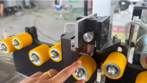 打孔系统 我们的内镶贴片式滴灌带打孔系统采用先进的自动化控制技术,主要由以下核心部件组成: 1.四工位或六工位打孔刀组:系统配备四个或六个独立工位的打孔刀具,可根据生产需求灵活配置; 2.门式红外线光电感应系统:采用高精度红外线感应进行位置检测,确保打孔位置的准确性; 3.智能控制系统:通过PLC自动控制,实现精准的时序控制和动作执行。 系统工作原理为:当滴灌带通过打孔工位时,门式红外线光电感应装置检测到贴片位置后触发信号,控制系统随即驱动打孔装置完成打孔动作。整个过程实现了全自动化控制,确保每个贴片的滴水孔洞精确一致。 操作模式选择